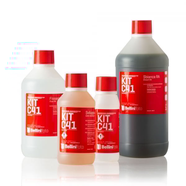 Bellini Kit C-41 1 Liter Negative Film Processing Kit contains products to make 1 liter of Developer – 1 liter of Bleach-RA – 1 liter of Fixer RA and 10 liters of Stabilizer.